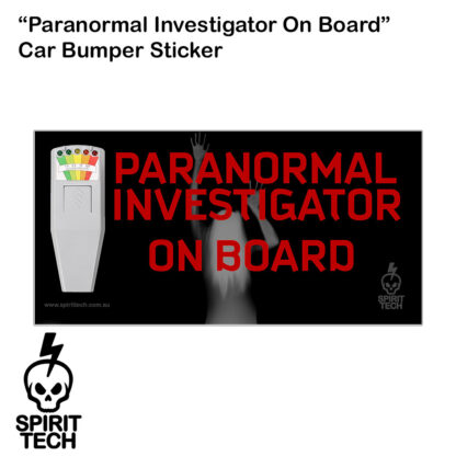 Weatherproof vinyl sticker featuring the all-popular K-II EMF meter and the wording “Paranormal Investigator On Board”. With strong adhesive, you can stick this sticker to most surfaces of a car without worrying about it falling off.